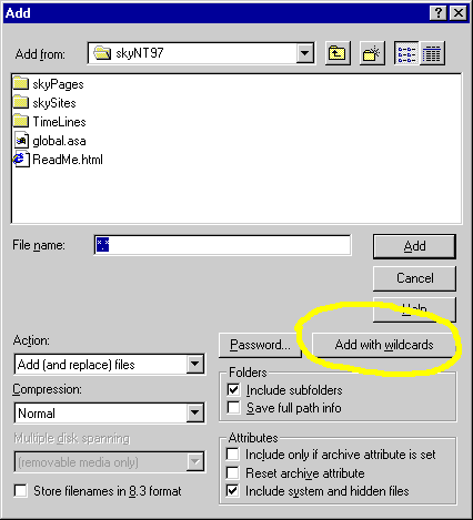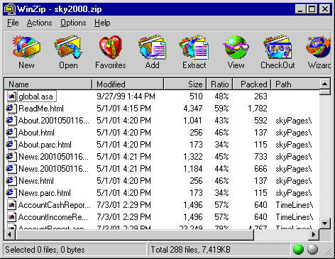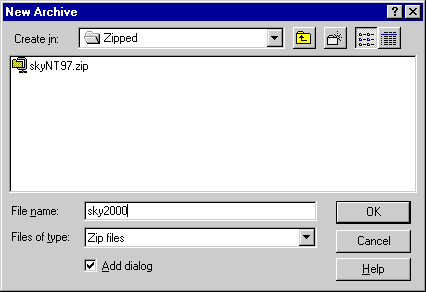 When using Winzip make absolutely sure that there are no pre-existing instances of skyNT97.zip, skyNT97.exe, sky2000.zip, or sky2000.exe files on the network of which your copy of Winzip is aware. If Winzip thinks it has information about pre-existing zip files, even when you create new archives it tries to stuff them with files listed in same named archives.
