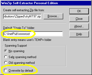 Suggest a folder (in the web site) where the skyNT97.exe will self extract. Be sure to uncheck the Overwrite by default checkbox to insure that the user will be prompted for file overwriting.