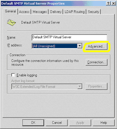 In the General tab of the overall display click the Advanced button to bind IP addresses and port numbers to the SMTP service.